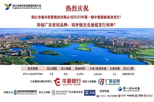 2025年1月15日,市城投集團在中國銀行間交易商協會成功發行“陽江市城市投資集團有限公司2025年第一期中期票據”。本期債券發行規模為6億元,期限為3年,票面利率2.15%,全場倍數超過3.1倍,合計申購機構數23家。本期債...